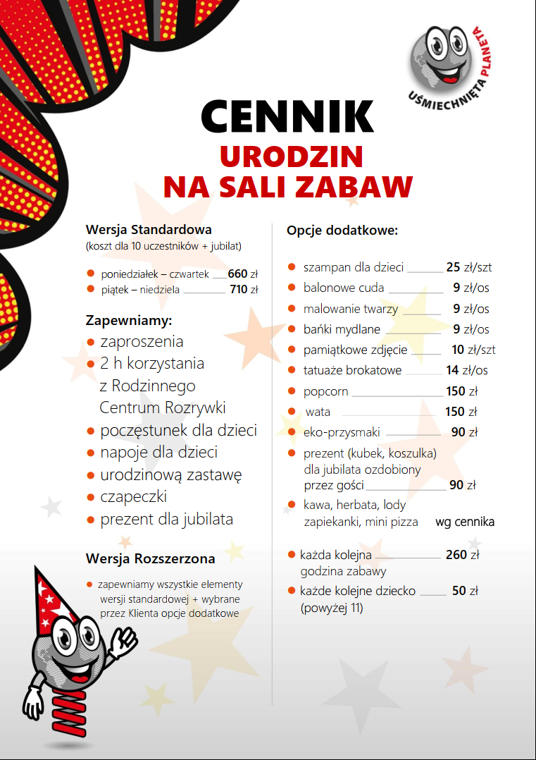Wersja Podstawowa w której jubilat wraz ze swoimi gośćmi przez 2h do woli korzystają ze wszystkich atrakcji naszej sali zabaw, posilając się przygotowanymi przez nas przekąskami i napojami. W pakiecie oferujemy również gotowe zaproszenia dla gości, a jubilata honorujemy prezentem prosto z Uśmiechniętej Planety.